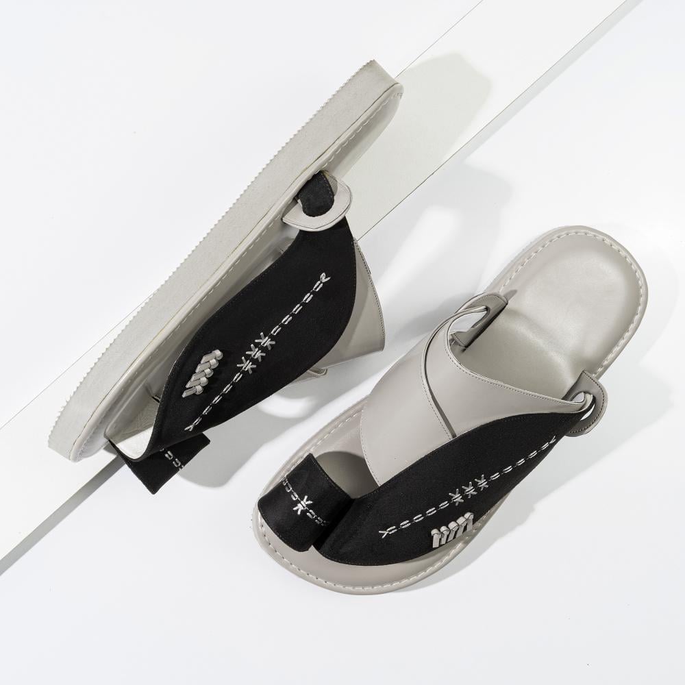 يتميز حذاء شرقي مطرز بتصميمه الفريد الذي يجمع بين الألوان الهادئة والملفتة، حيث يأتي باللون البيج الفاتح مع تفاصيل سوداء أنيقة. تم استخدام مواد جلدية عالية الجودة، مما يمنح الحذاء ملمساً ناعماً ومظهراً لامعاً، بينما تضيف الأجزاء السوداء لمسة من الأناقة. إن تصميمه ذو الحواف المنحنية يوفر راحة إضافية، مما يجعله مثالياً للاستخدام اليومي والرسمية.